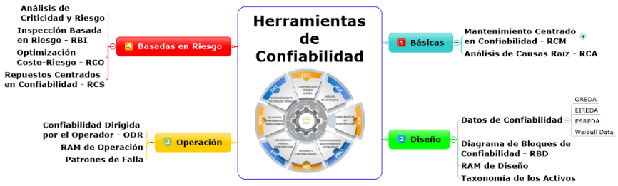 Desde los inicios de los estudios Confiabilidad que pudieron comenzar en la NASA en noviembre de 1949, varias herramientas han sido creadas para apoyar esta cultura o filosofía. Este conjunto de herramientas que se han convertido en ese apoyo para consultores y ejecutores, las he dividido para efectos prácticos en 4 grandes grupos. De esta manera, les muestro no solo el momento oportuno de ponerlas en práctica, sino también su interrelación con las otras herramientas: